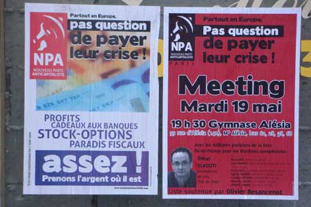 De passage en France, j’avais fait un petit reportage photo sur les posters des listes, affichés rue Ivan-Couronne. Pas de visuel UMP, qui avait semble-t-il décidé de placarder tard pour gagner plus. Meanwhile, elle matraquait à la télé son effroyable clip où Xavier Bertrand et Michel Barnier succubaient les permanents du Mouvement populaire voire des passants dans la rue (dans tout politicien il y a un méchant de «Matrix» qui sommeille) ; grâce à sa bi-incarnation dans le Nouveau Centre, l’UMP pouvait même matraquer doublement en disposant d’un second temps de diffusion. Enfin c’était le printemps, les enfants jouaient au ballon en faisant des petits piaillements d’enfants, le soleil dégoulinait sa lumière, le soir tombait, Paris ignorait l’imminence du chômage de Benoît Hamon.